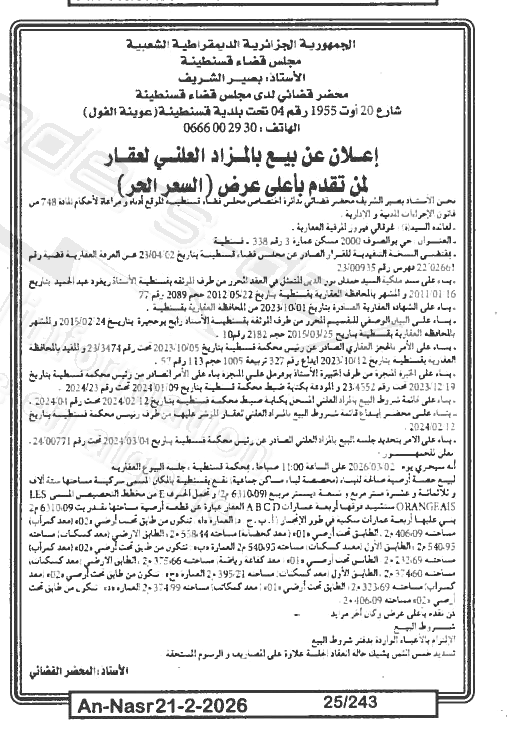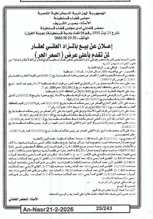 Il sera procédé à la vente au plus offrant et dernier enchérisseur le : 28/02/2026';