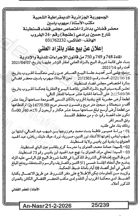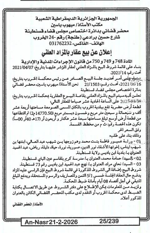 Il sera procédé à la vente au plus offrant et dernier enchérisseur le : 28/02/2026';