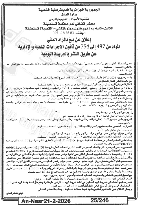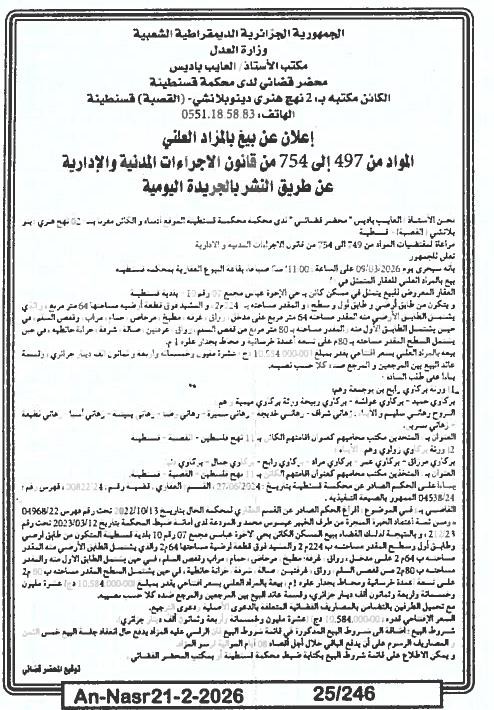 Il sera procédé à la vente au plus offrant et dernier enchérisseur le : 28/02/2026';