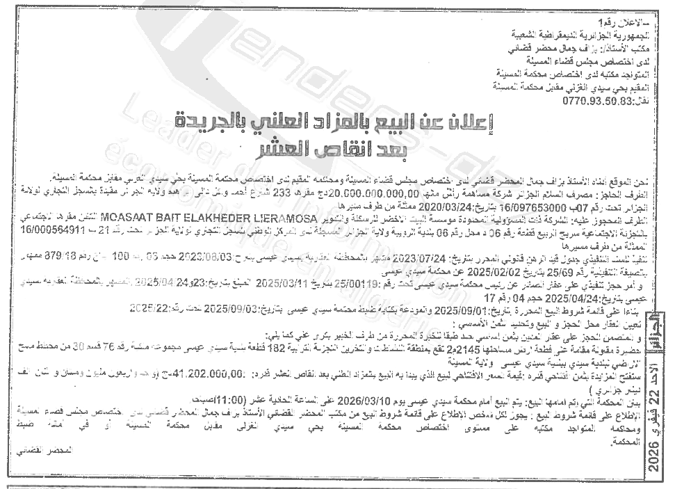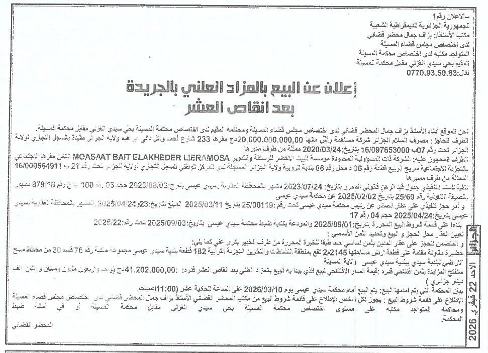 Il sera procédé à la vente au plus offrant et dernier enchérisseur le :