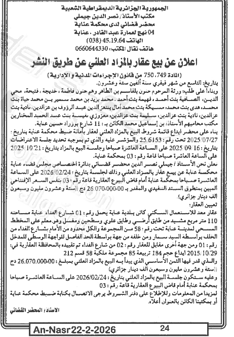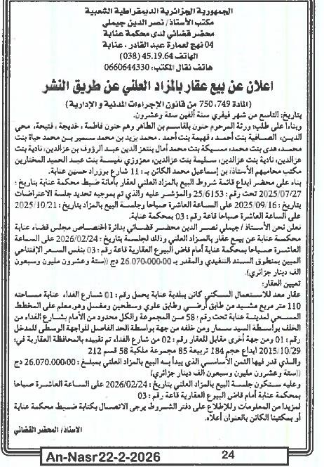 Il sera procédé à la vente au plus offrant et dernier enchérisseur le :