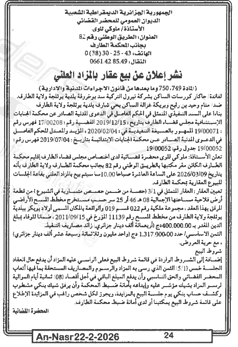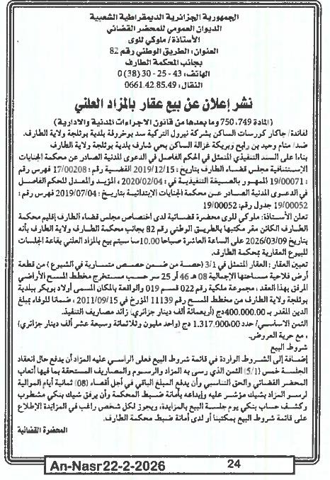 Il sera procédé à la vente au plus offrant et dernier enchérisseur le :