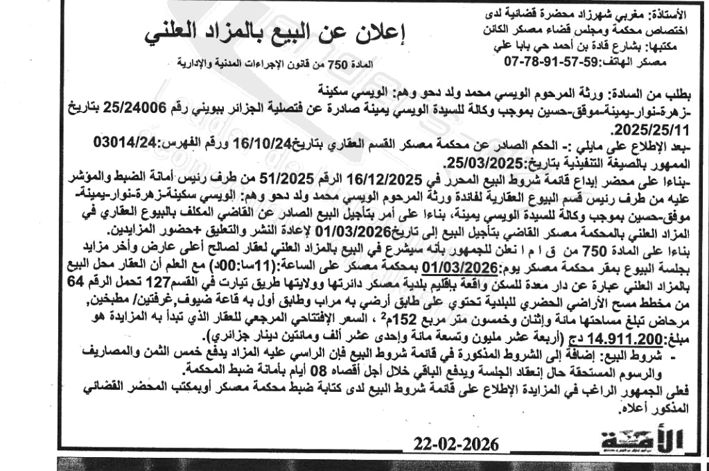 Il sera procédé à la vente au plus offrant et dernier enchérisseur le :