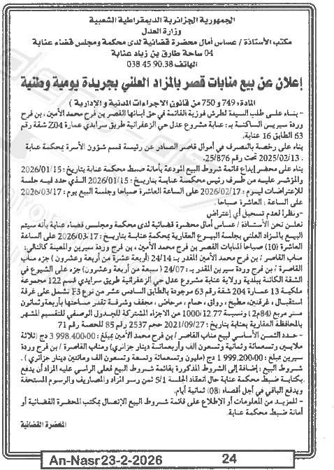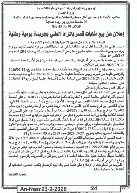 Il sera procédé à la vente au plus offrant et dernier enchérisseur le : 17/03/2026';