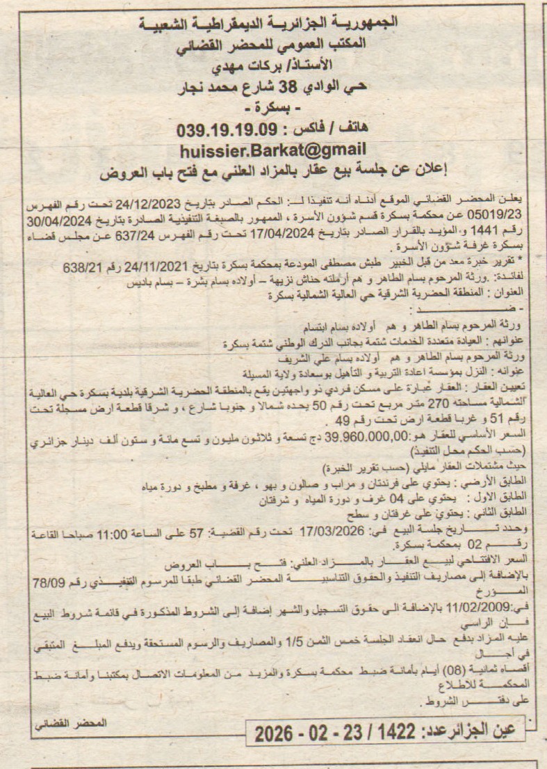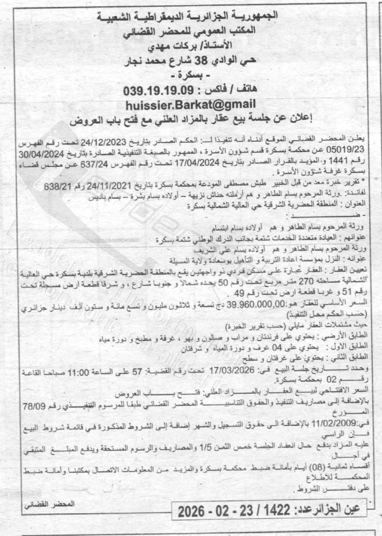 Il sera procédé à la vente au plus offrant et dernier enchérisseur le :