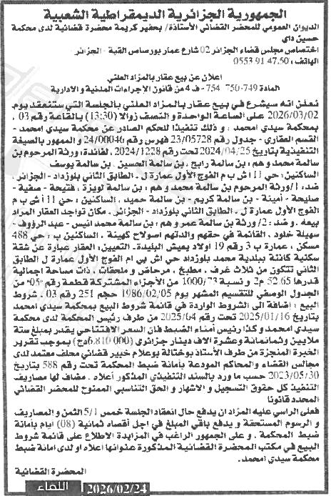 Il sera procédé à la vente au plus offrant et dernier enchérisseur le : 02/03/2026';