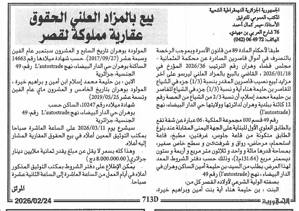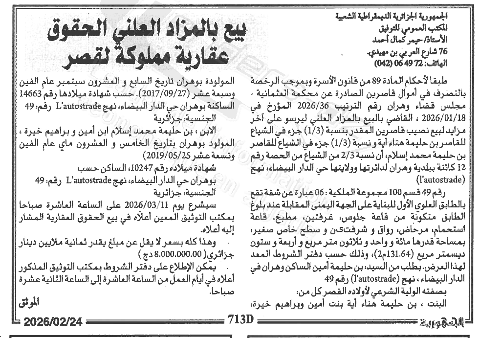 Il sera procédé à la vente au plus offrant et dernier enchérisseur le :