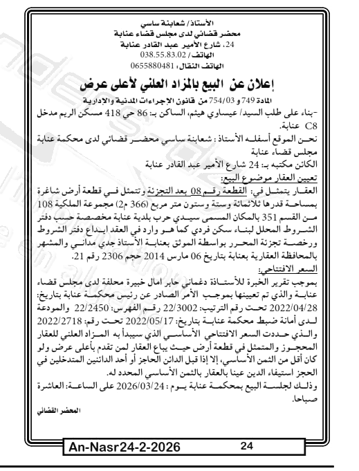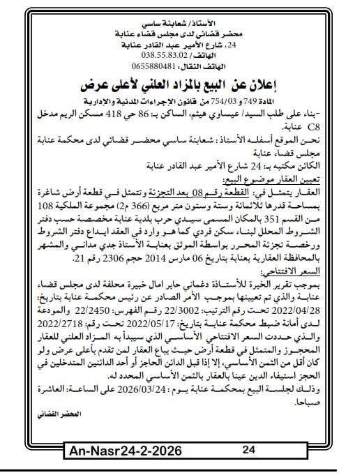 Il sera procédé à la vente au plus offrant et dernier enchérisseur le : 24/03/2026';