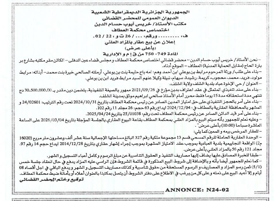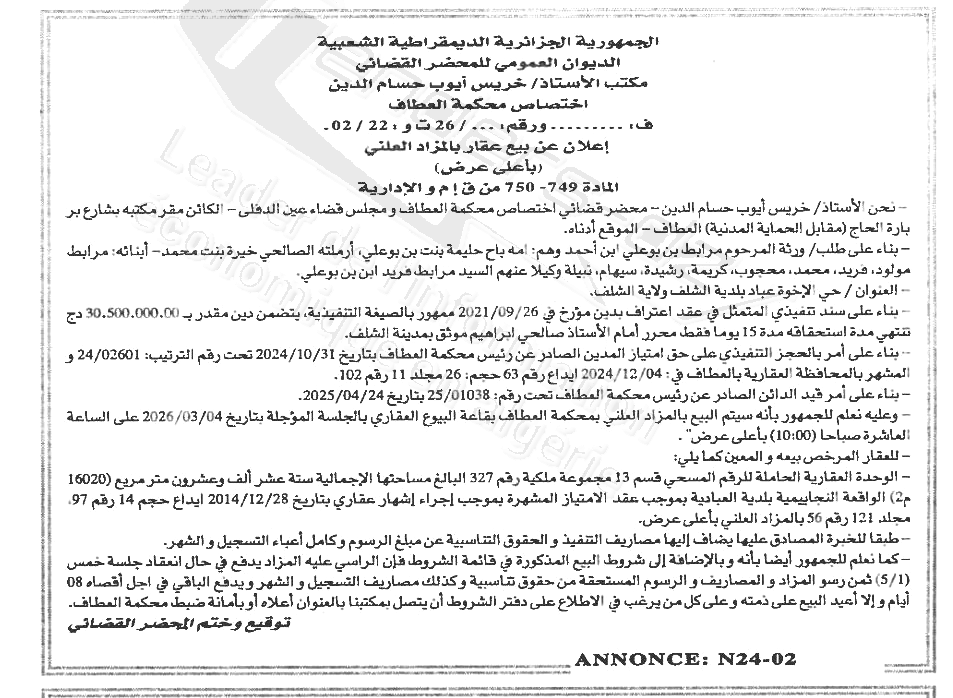 Il sera procédé à la vente au plus offrant et dernier enchérisseur le : 04/03/2026';