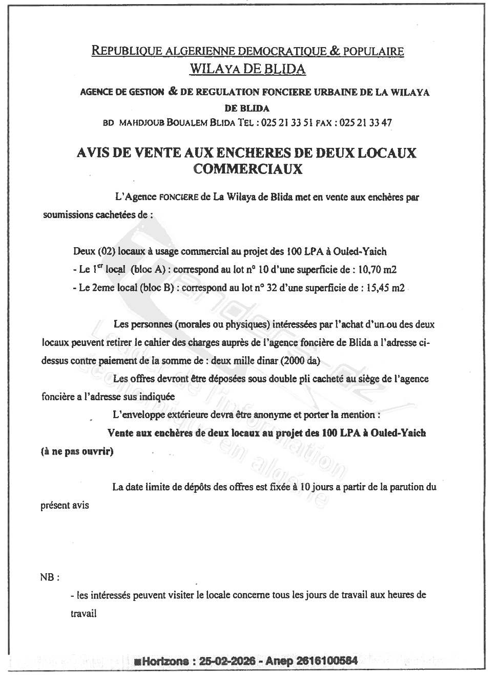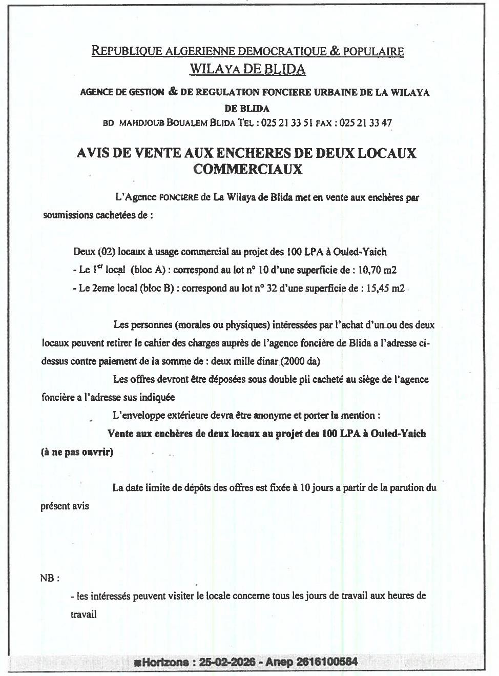 | Objet: Vente 02 locaux commerciaux | |