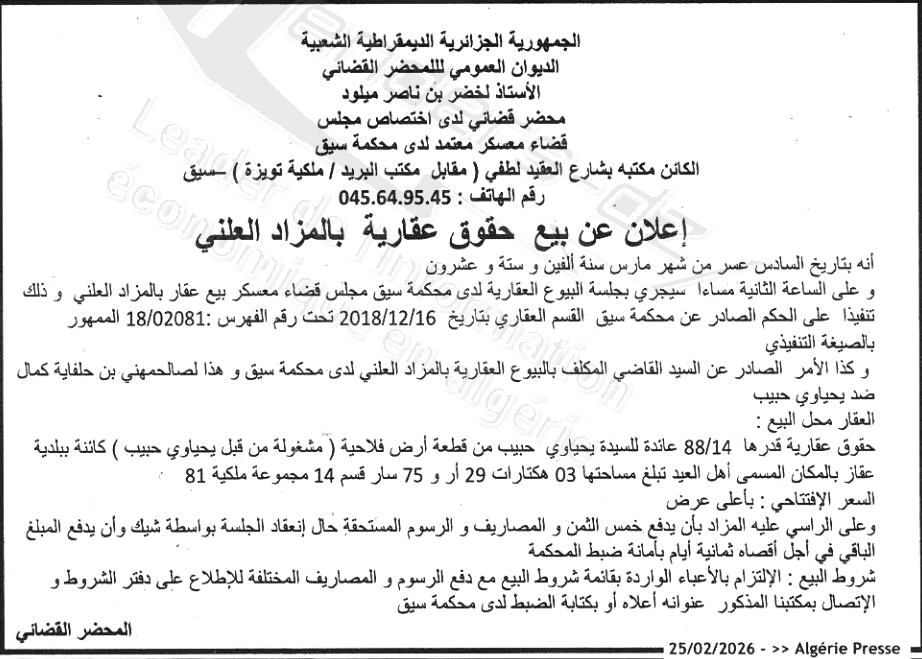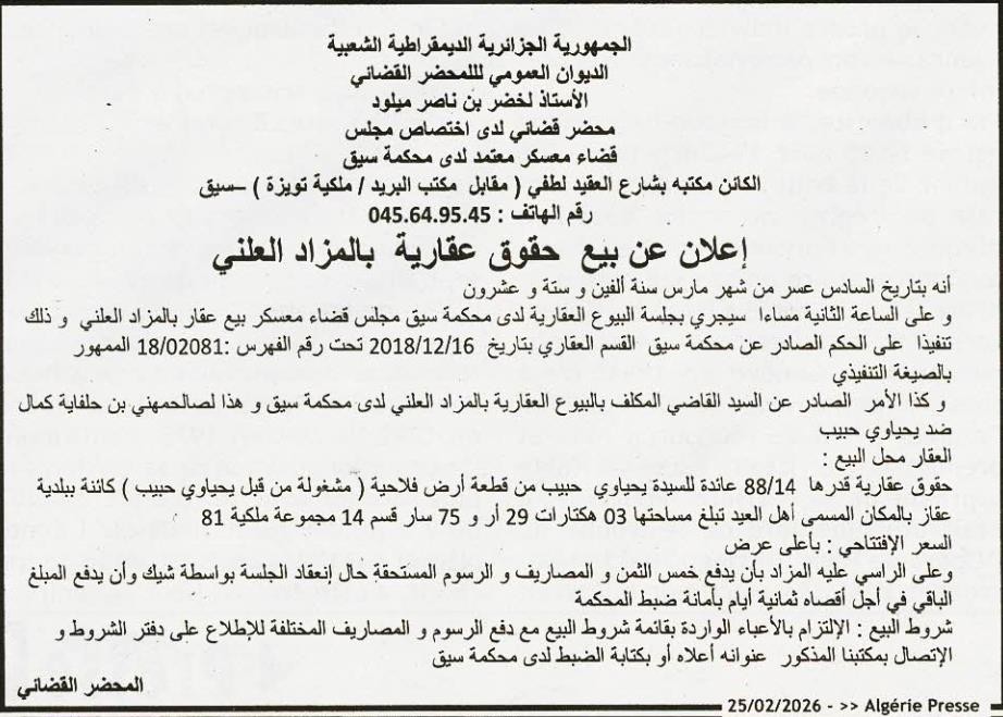 Il sera procédé à la vente au plus offrant et dernier enchérisseur le :