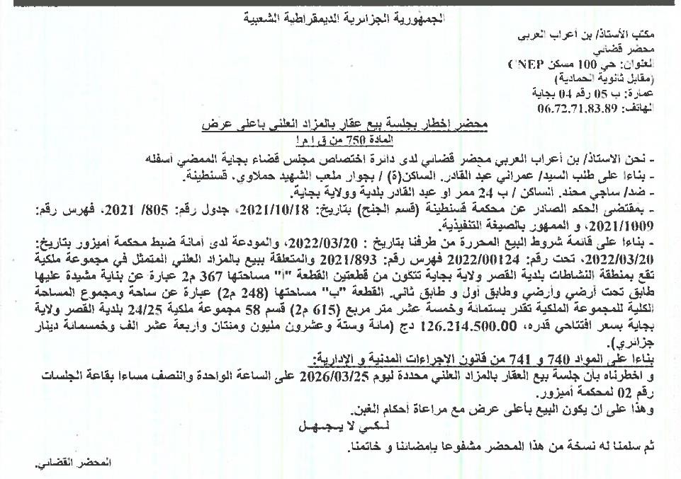 Il sera procédé à la vente au plus offrant et dernier enchérisseur le :