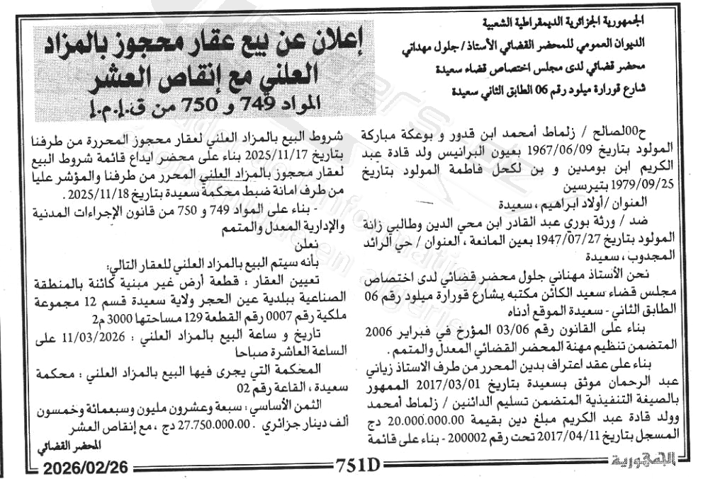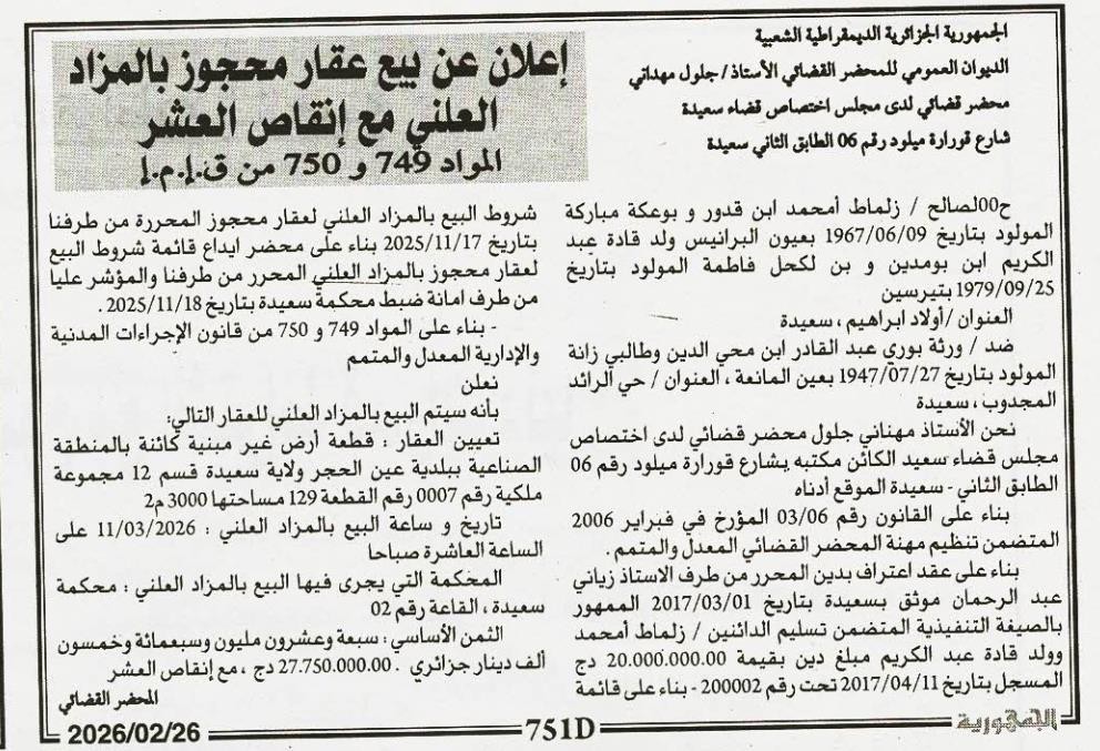 Il sera procédé à la vente au plus offrant et dernier enchérisseur le :