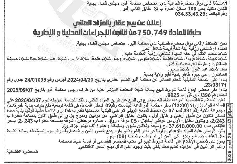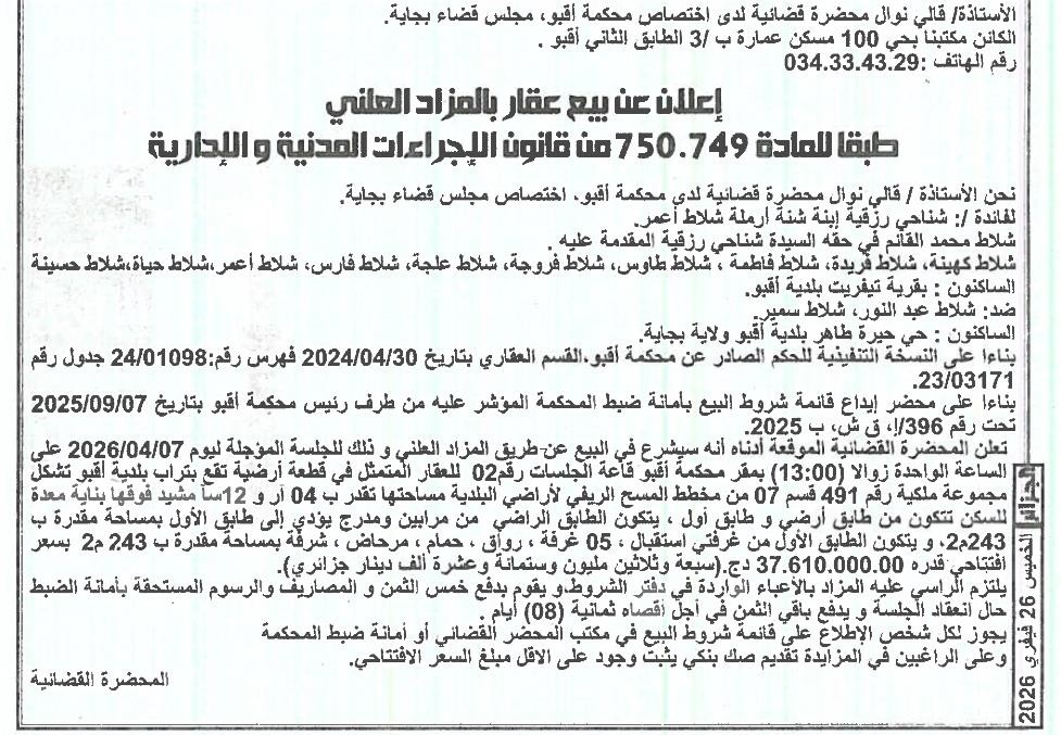 Il sera procédé à la vente au plus offrant et dernier enchérisseur le : 05/03/2026';