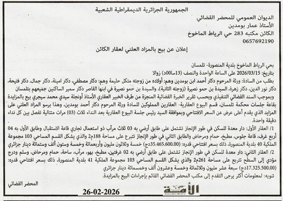 Il sera procédé à la vente au plus offrant et dernier enchérisseur le : 05/03/2026';