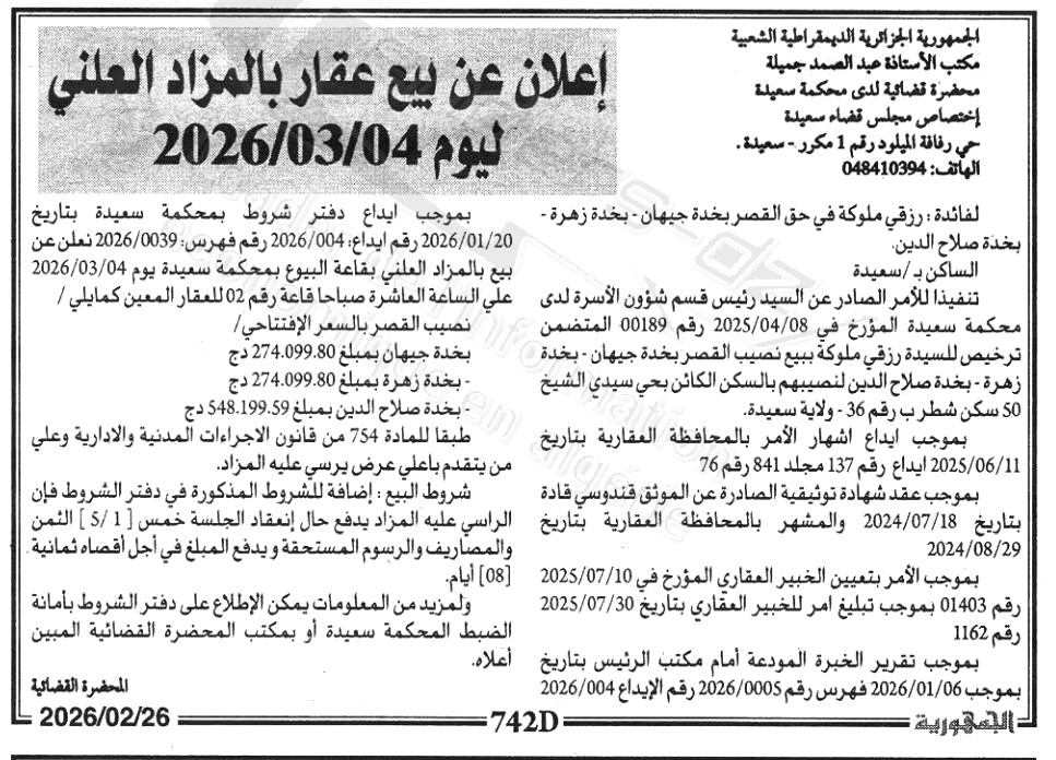 Il sera procédé à la vente au plus offrant et dernier enchérisseur le :