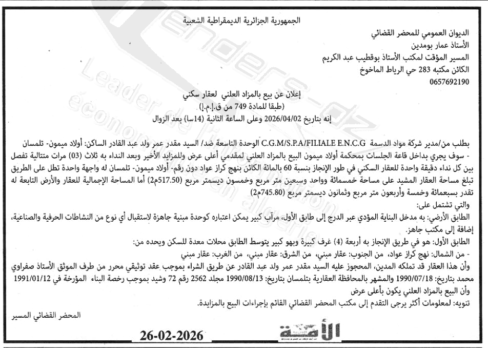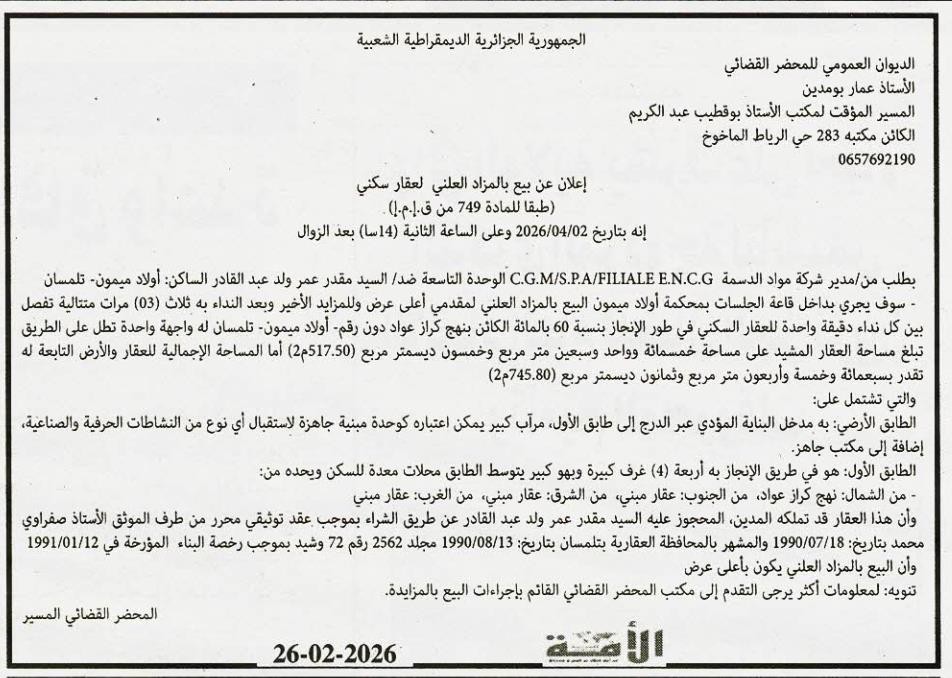 Il sera procédé à la vente au plus offrant et dernier enchérisseur le : 05/03/2026';