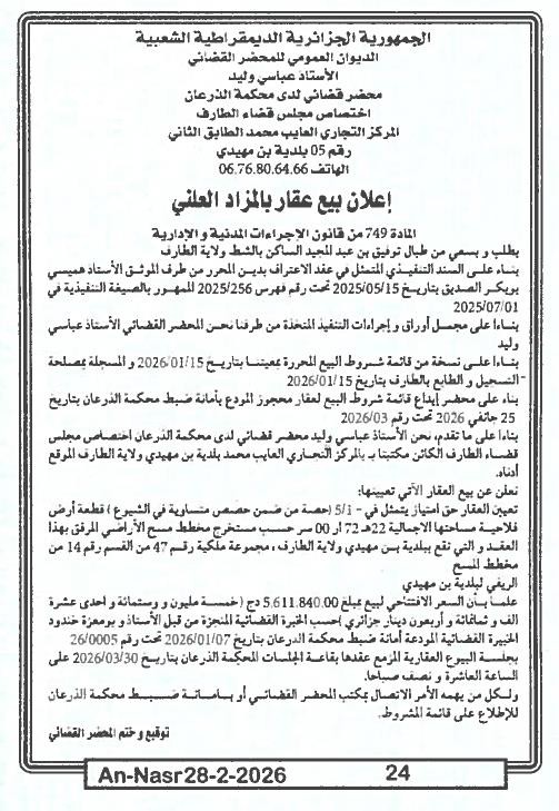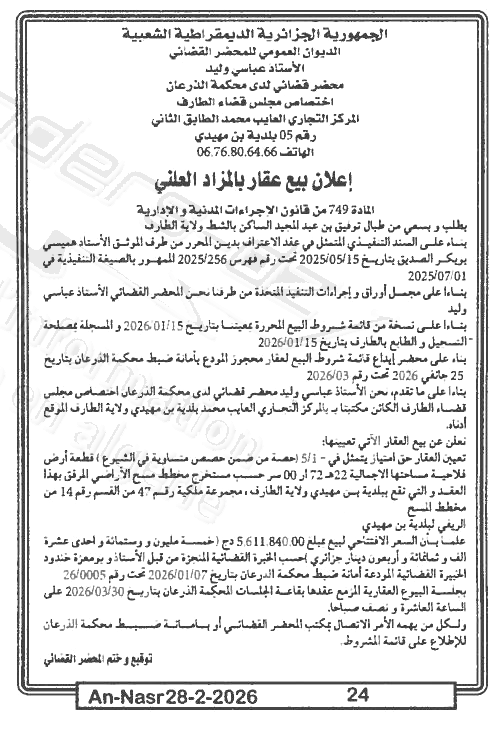 Il sera procédé à la vente au plus offrant et dernier enchérisseur le :