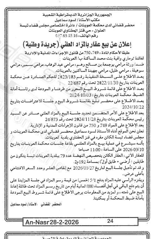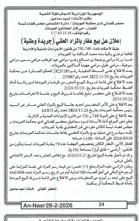 Il sera procédé à la vente au plus offrant et dernier enchérisseur le : 10/03/2026';