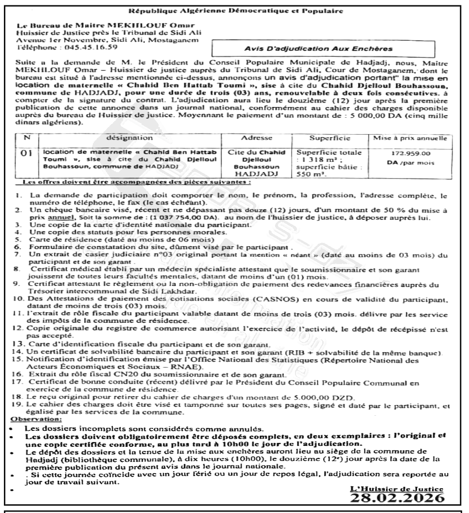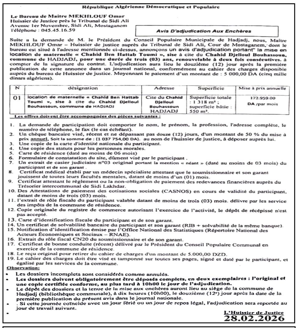 | Objet: Location de maternelle Chahid Ben Hattab Toumi | |