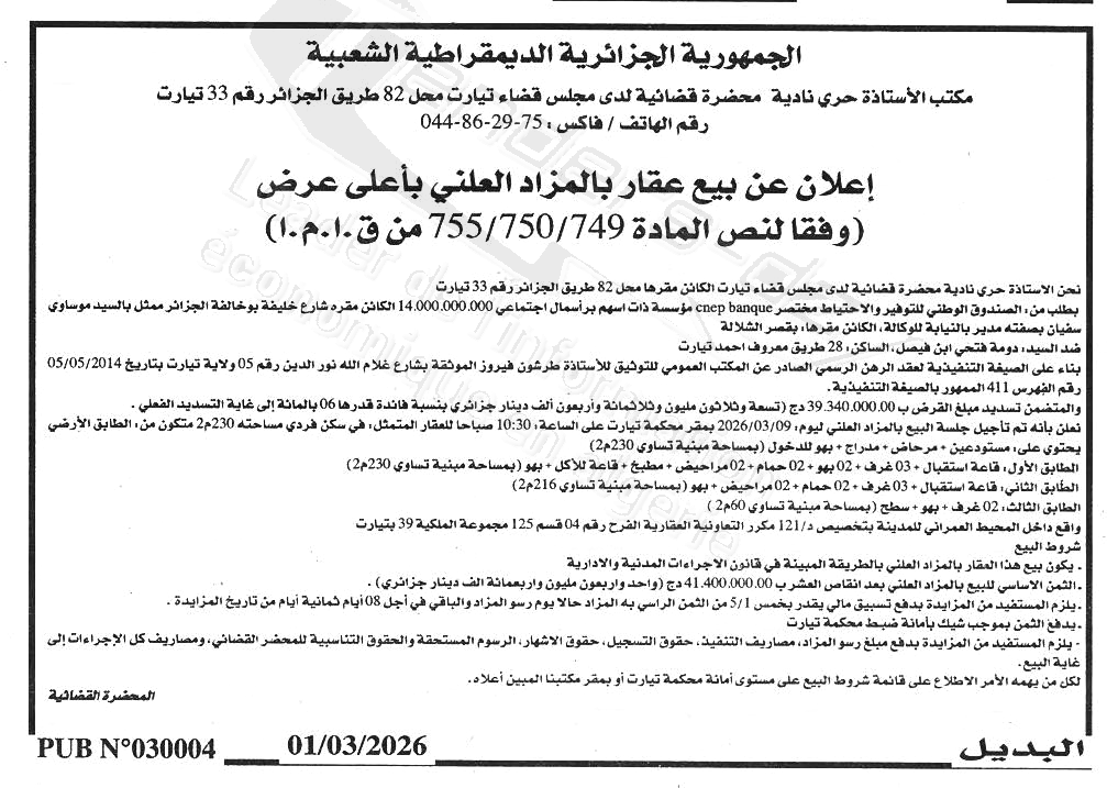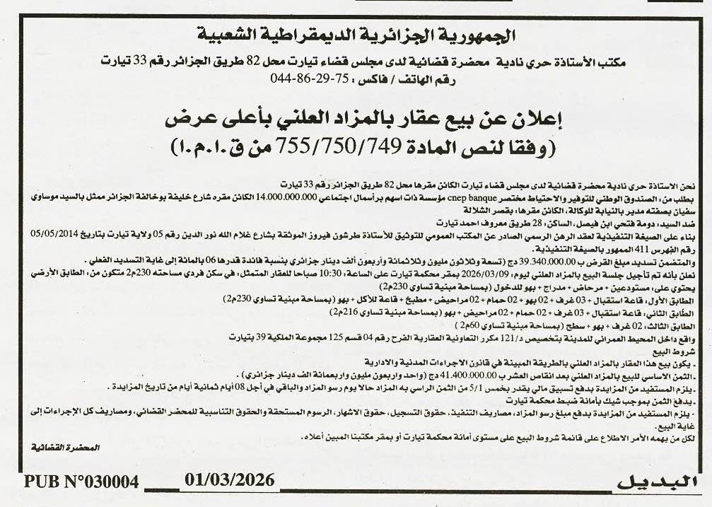 Il sera procédé à la vente au plus offrant et dernier enchérisseur le : 09/03/2026';