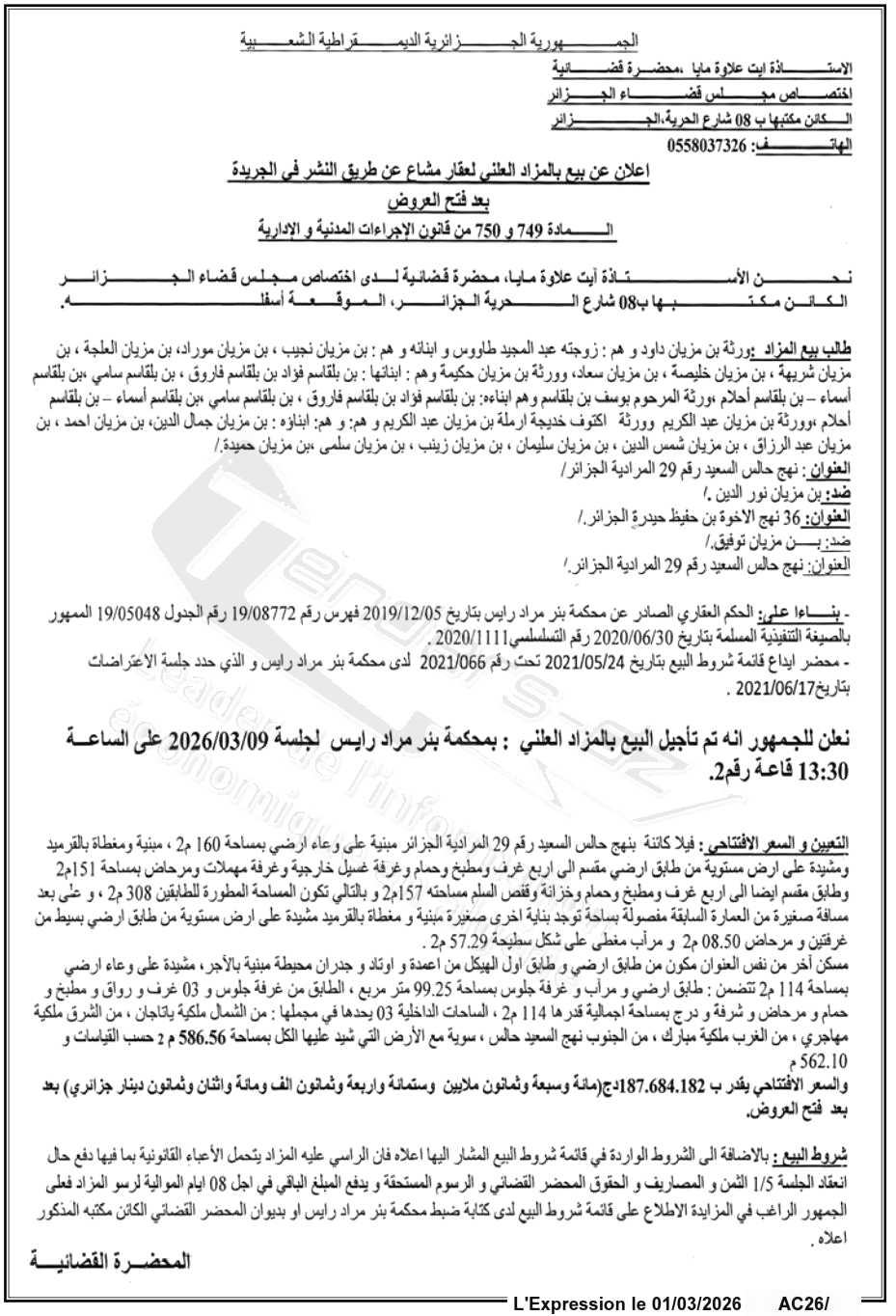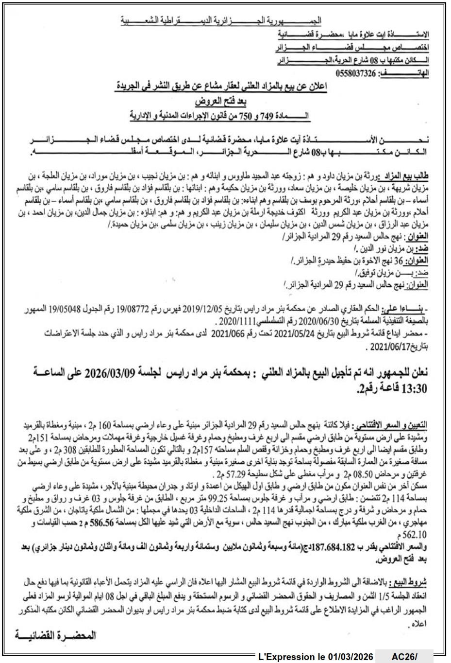 Il sera procédé à la vente au plus offrant et dernier enchérisseur le :