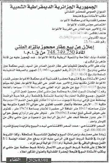 Il sera procédé à la vente au plus offrant et dernier enchérisseur le :