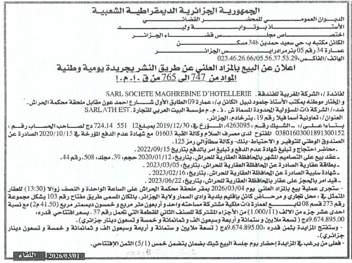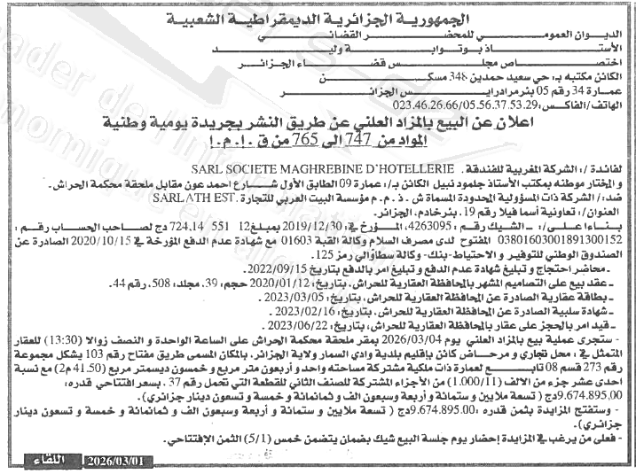 Il sera procédé à la vente au plus offrant et dernier enchérisseur le : 04/03/2026';