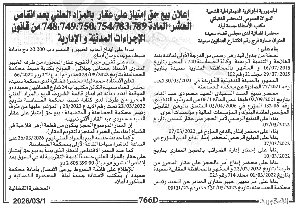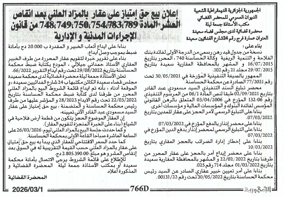 Il sera procédé à la vente au plus offrant et dernier enchérisseur le : 26/03/2026';