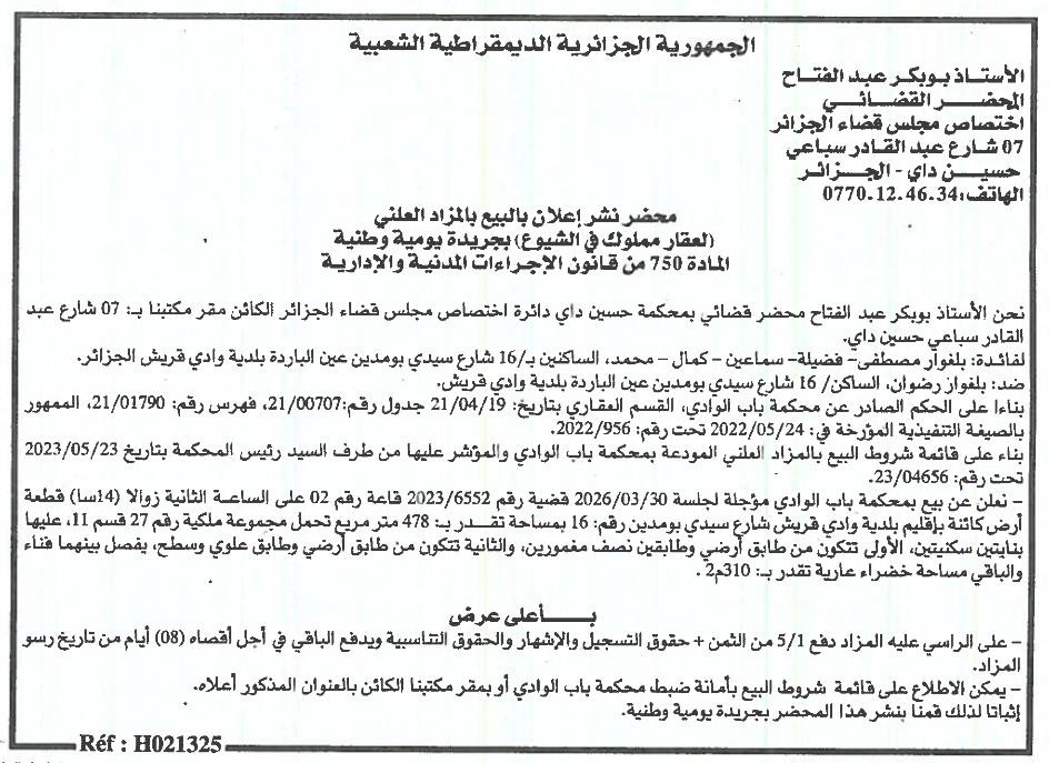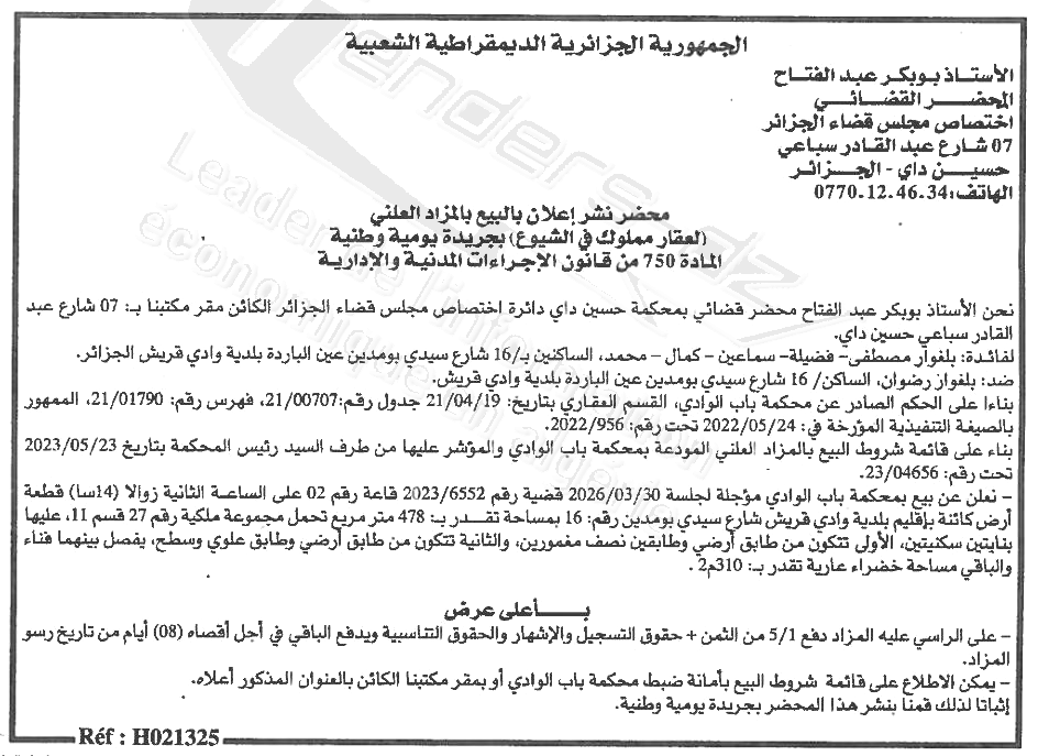 Il sera procédé à la vente au plus offrant et dernier enchérisseur le :