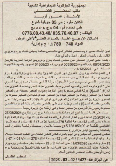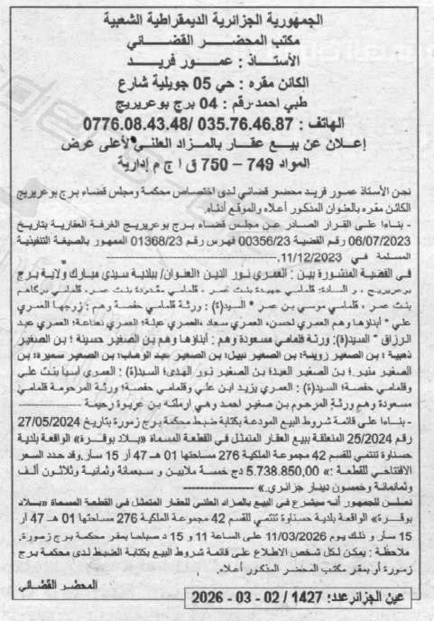 Il sera procédé à la vente au plus offrant et dernier enchérisseur le : 09/03/2026';
