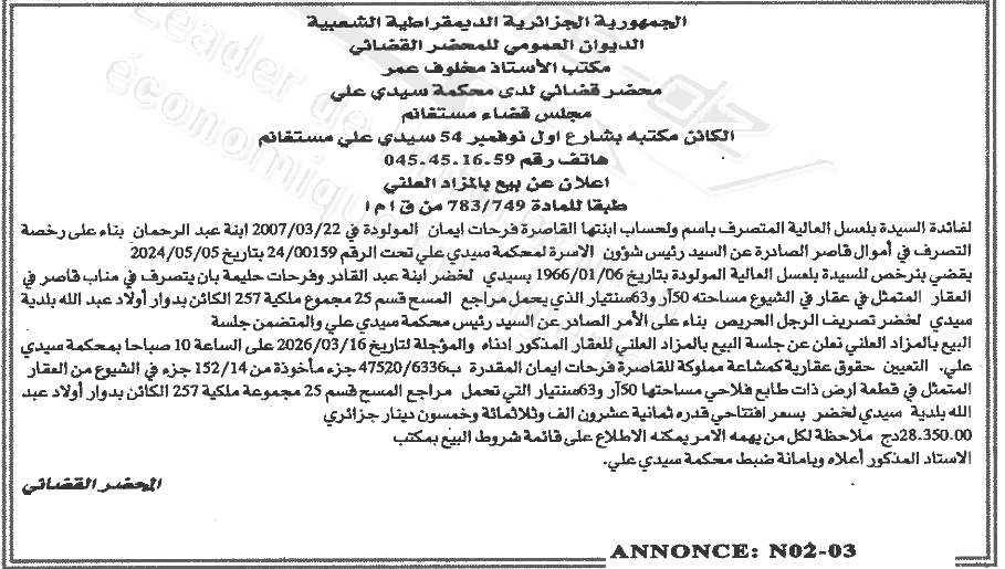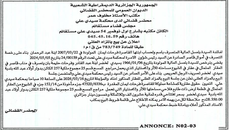 Il sera procédé à la vente au plus offrant et dernier enchérisseur le :