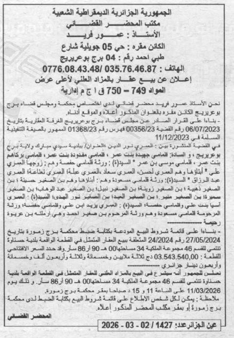 Il sera procédé à la vente au plus offrant et dernier enchérisseur le : 11/03/2026';