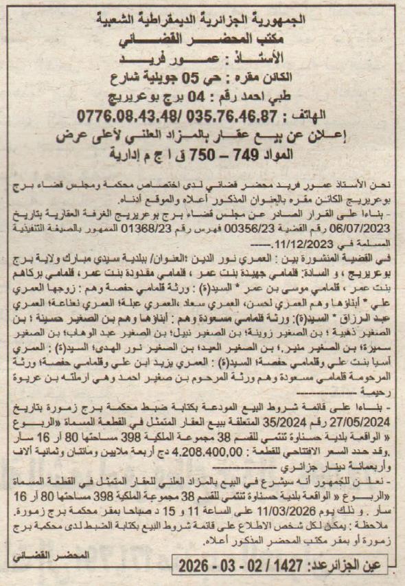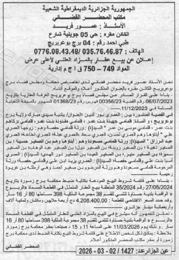 Il sera procédé à la vente au plus offrant et dernier enchérisseur le : 11/03/2026';