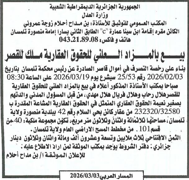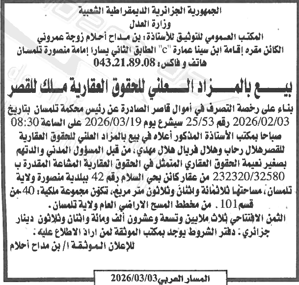 Il sera procédé à la vente au plus offrant et dernier enchérisseur le :