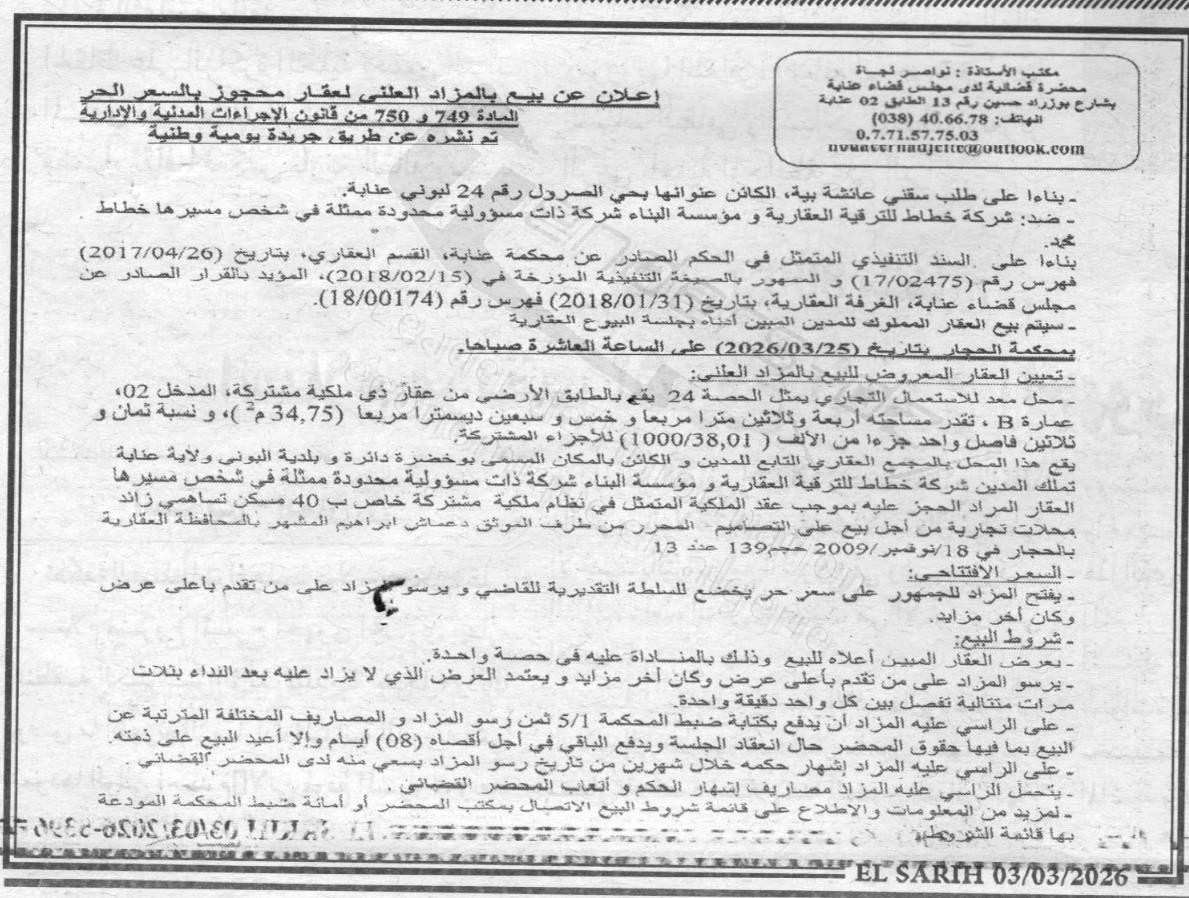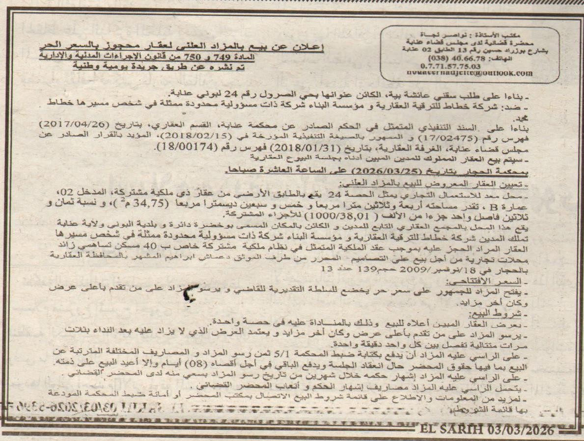 Il sera procédé à la vente au plus offrant et dernier enchérisseur le :