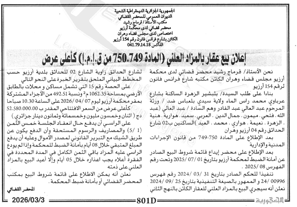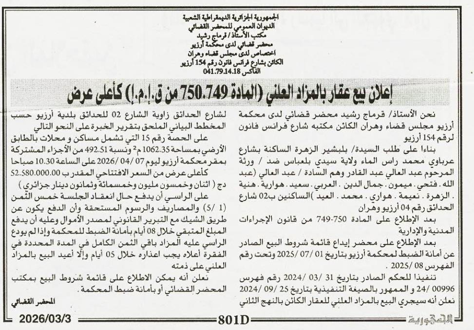 Il sera procédé à la vente au plus offrant et dernier enchérisseur le :
