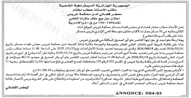 Il sera procédé à la vente au plus offrant et dernier enchérisseur le :