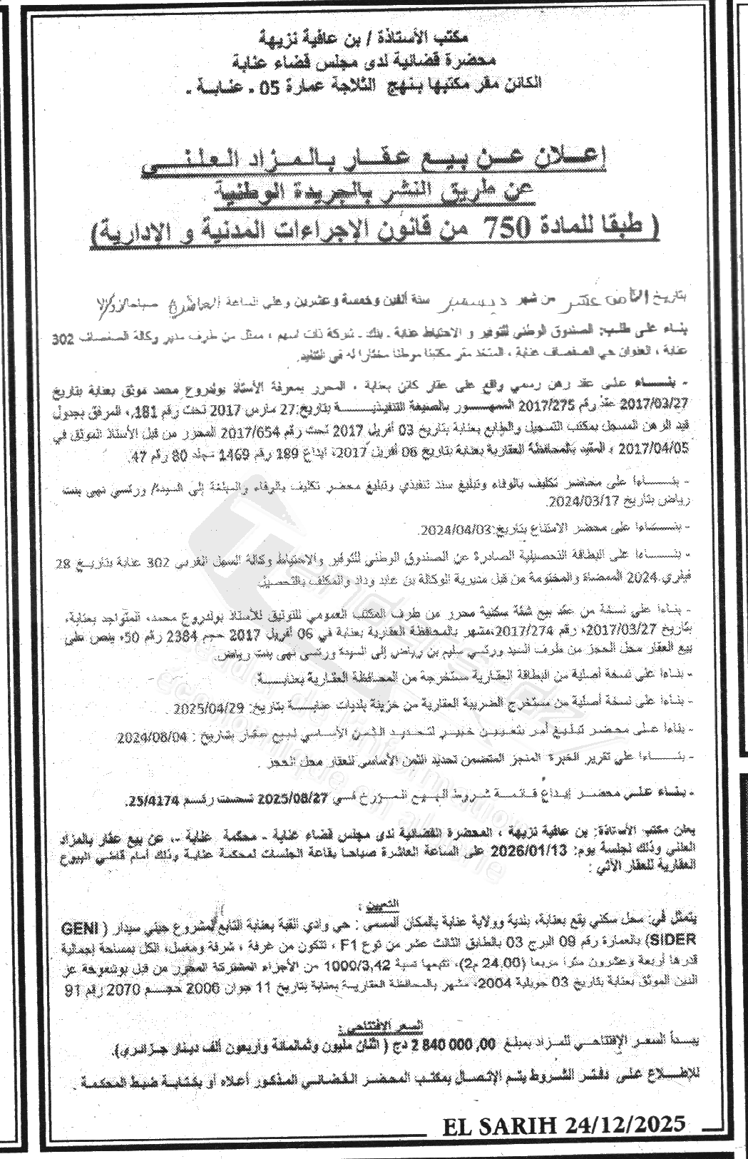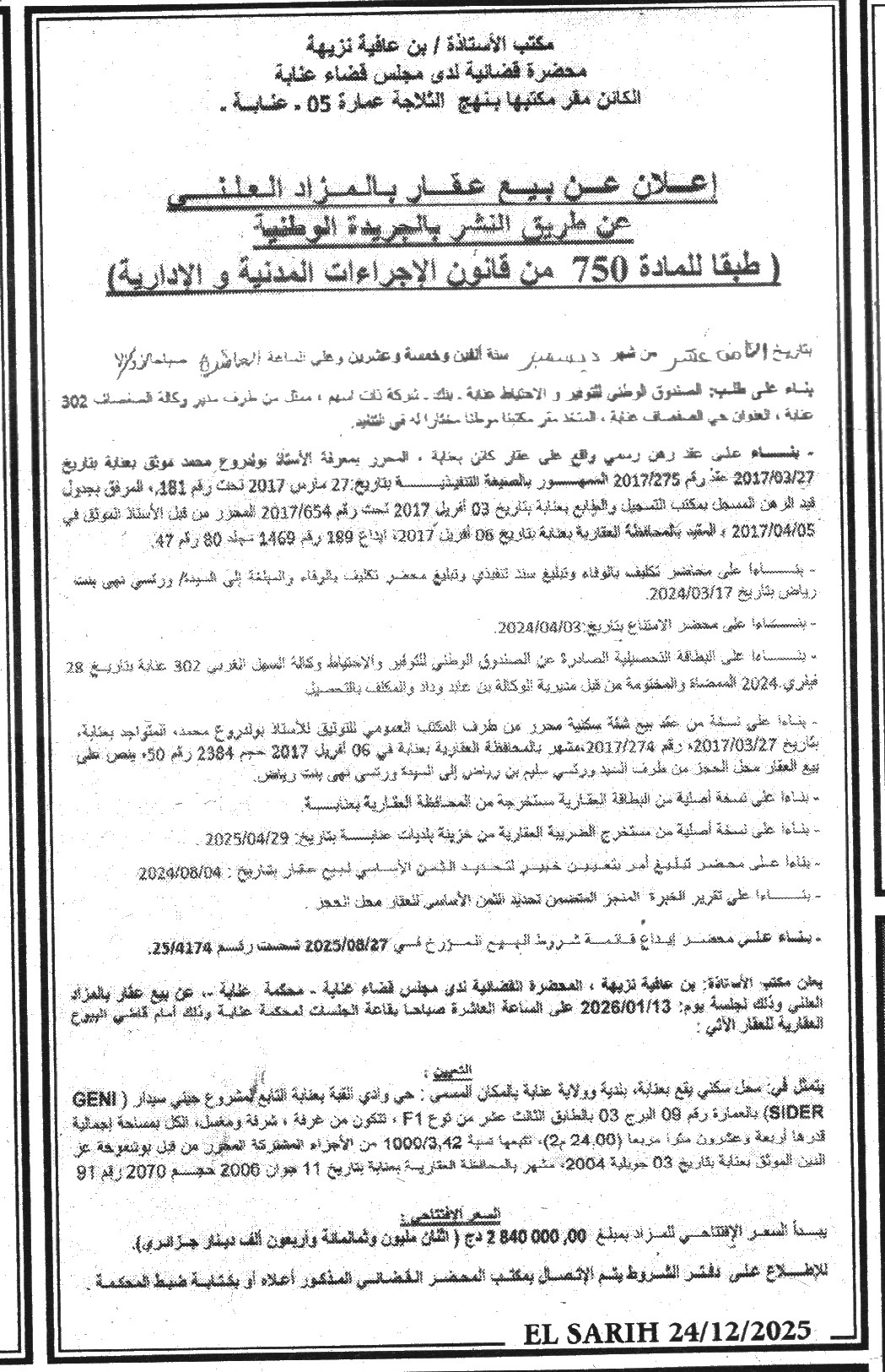 Il sera procédé à la vente au plus offrant et dernier enchérisseur le : 13/01/2026';