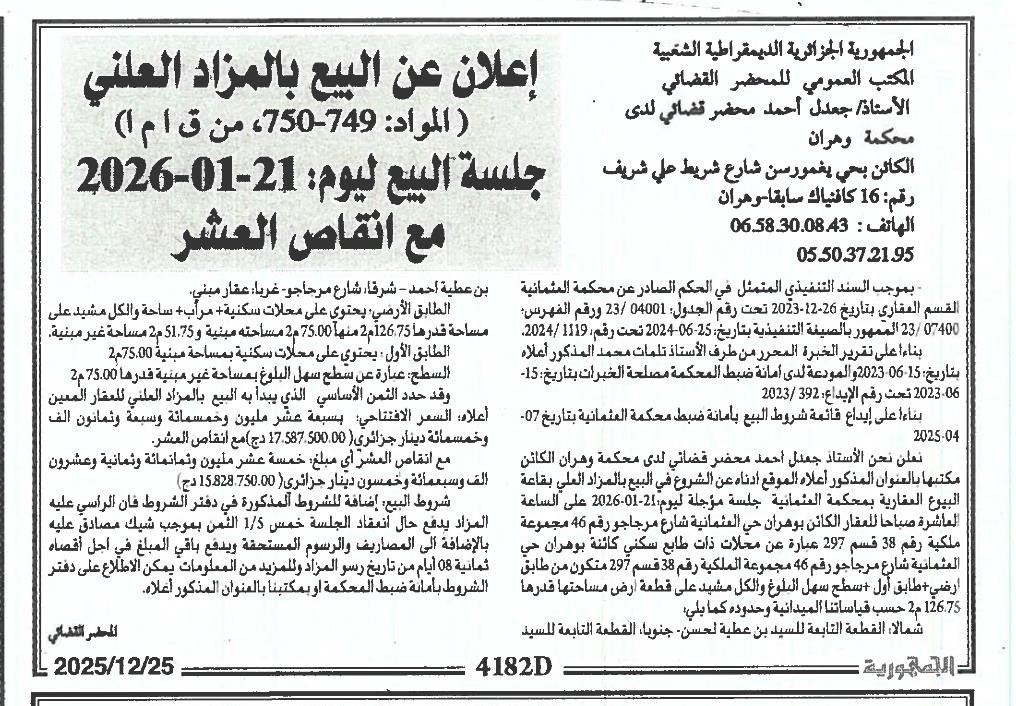 Il sera procédé à la vente au plus offrant et dernier enchérisseur le : 21/01/2026';