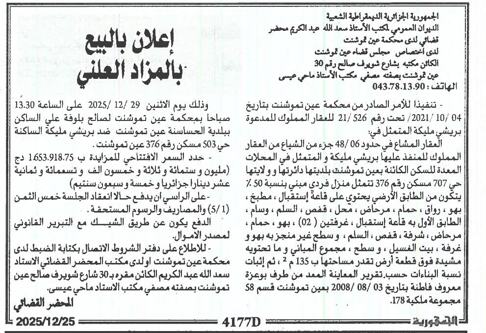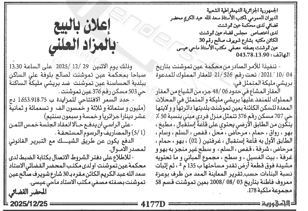 Il sera procédé à la vente au plus offrant et dernier enchérisseur le : 29/12/2025';