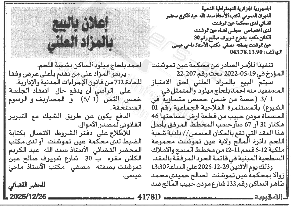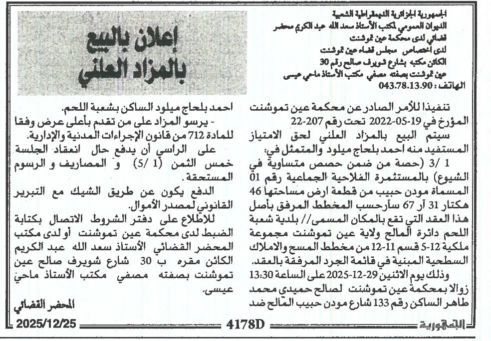 Il sera procédé à la vente au plus offrant et dernier enchérisseur le : 29/12/2025';