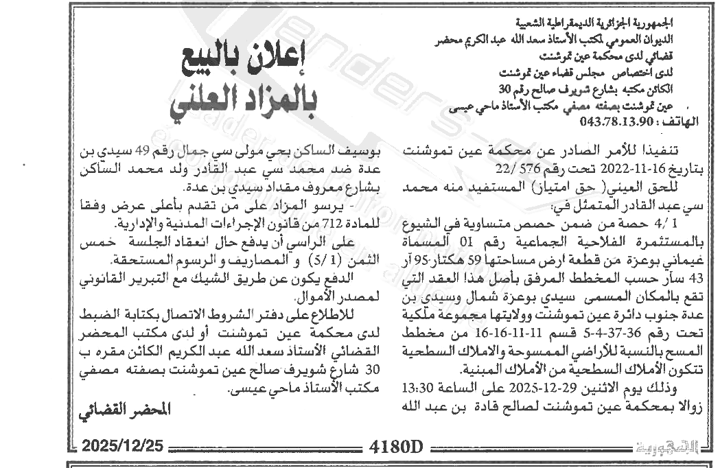 Il sera procédé à la vente au plus offrant et dernier enchérisseur le : 29/12/2025';