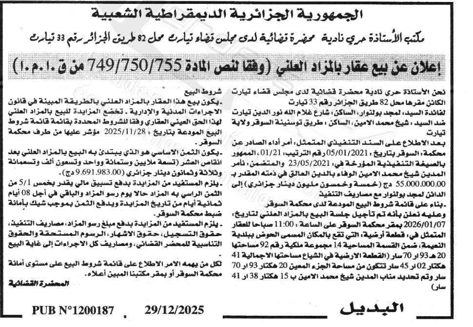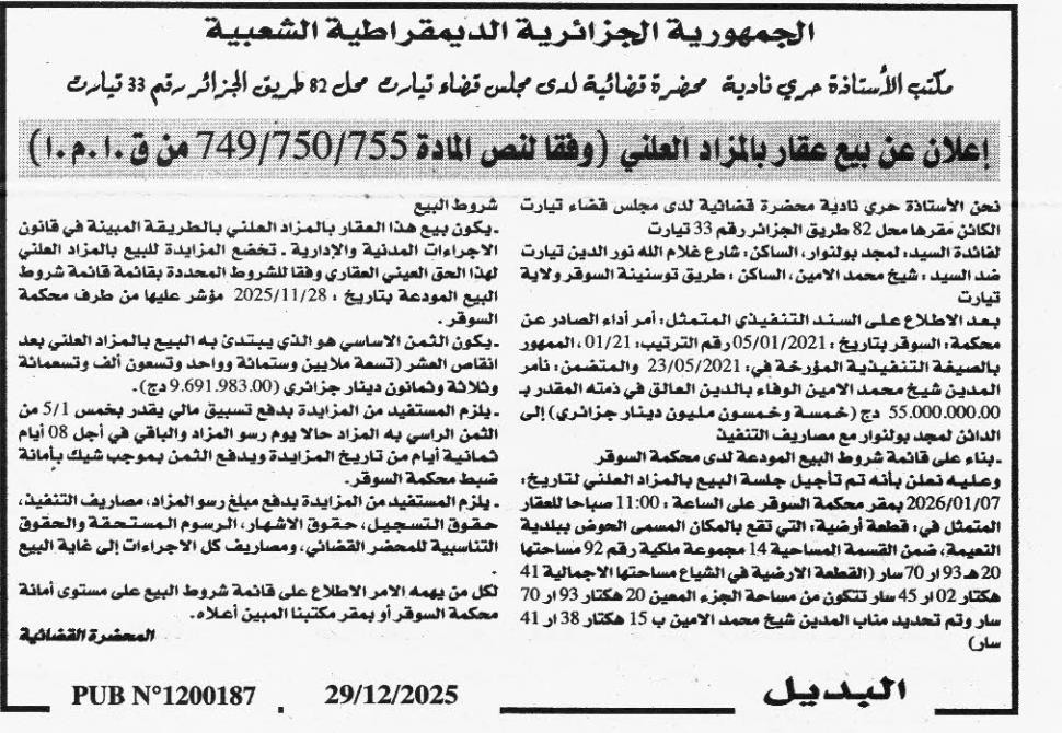Il sera procédé à la vente au plus offrant et dernier enchérisseur le :