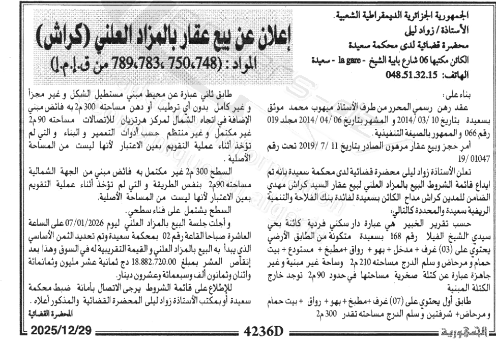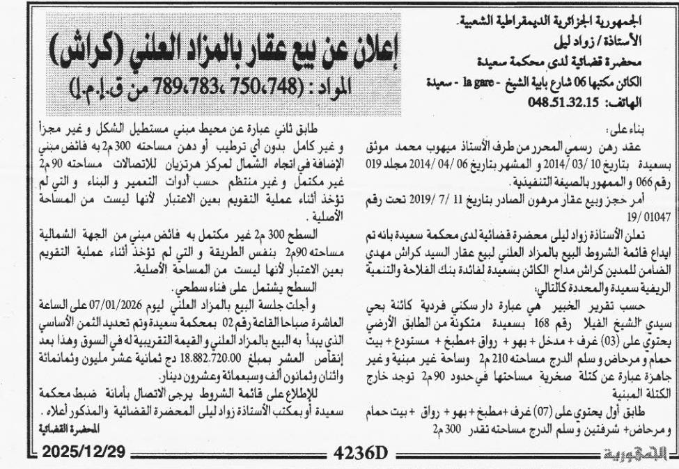 Il sera procédé à la vente au plus offrant et dernier enchérisseur le :