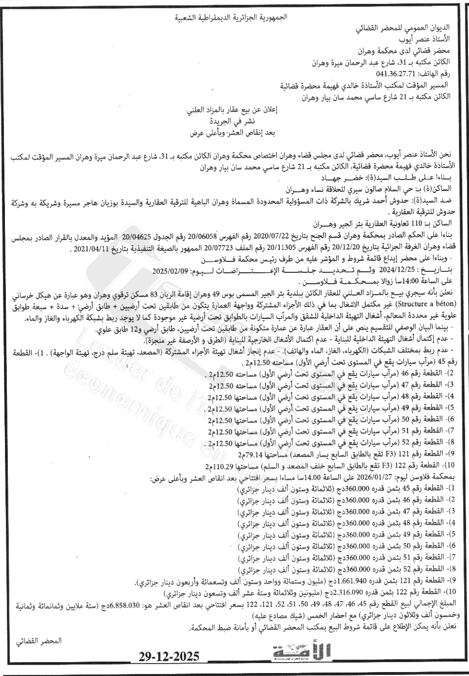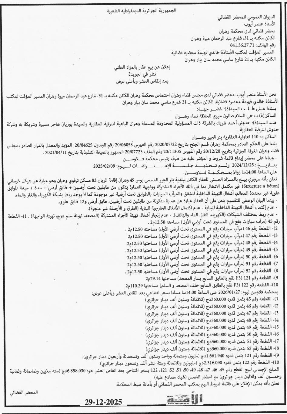 Il sera procédé à la vente au plus offrant et dernier enchérisseur le : 27/01/2026';