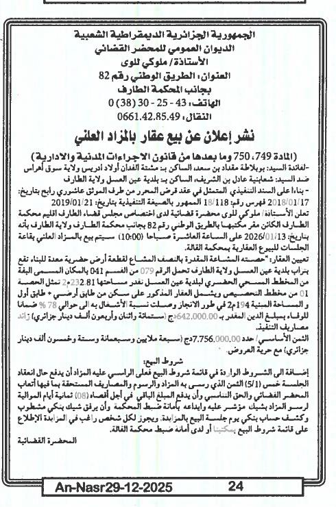 Il sera procédé à la vente au plus offrant et dernier enchérisseur le :