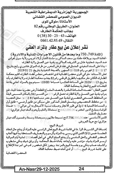 Il sera procédé à la vente au plus offrant et dernier enchérisseur le : 05/01/2026';