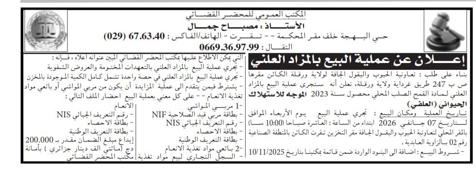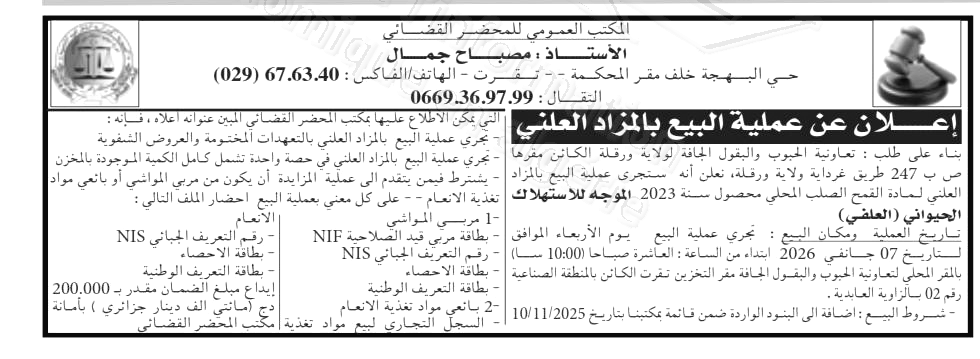 | Objet: Vente de blé dur local, récolte de l’année 2023 | |