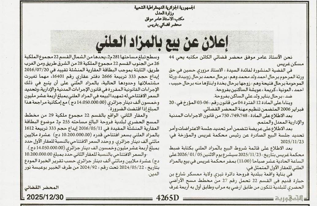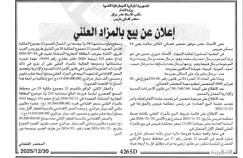 Il sera procédé à la vente au plus offrant et dernier enchérisseur le :